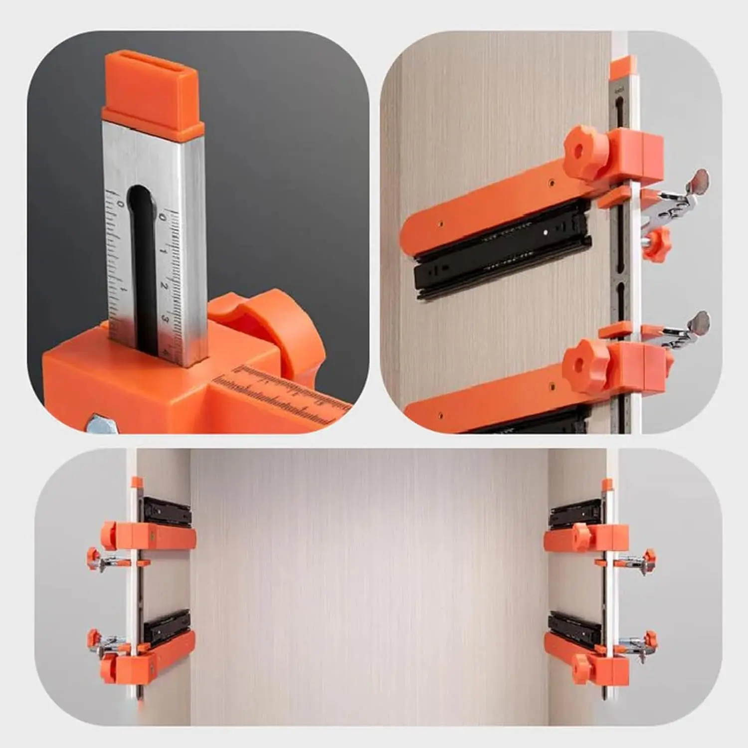 Compact and durable drawer slide jig made from stainless steel and impact-resistant ABS plastic.