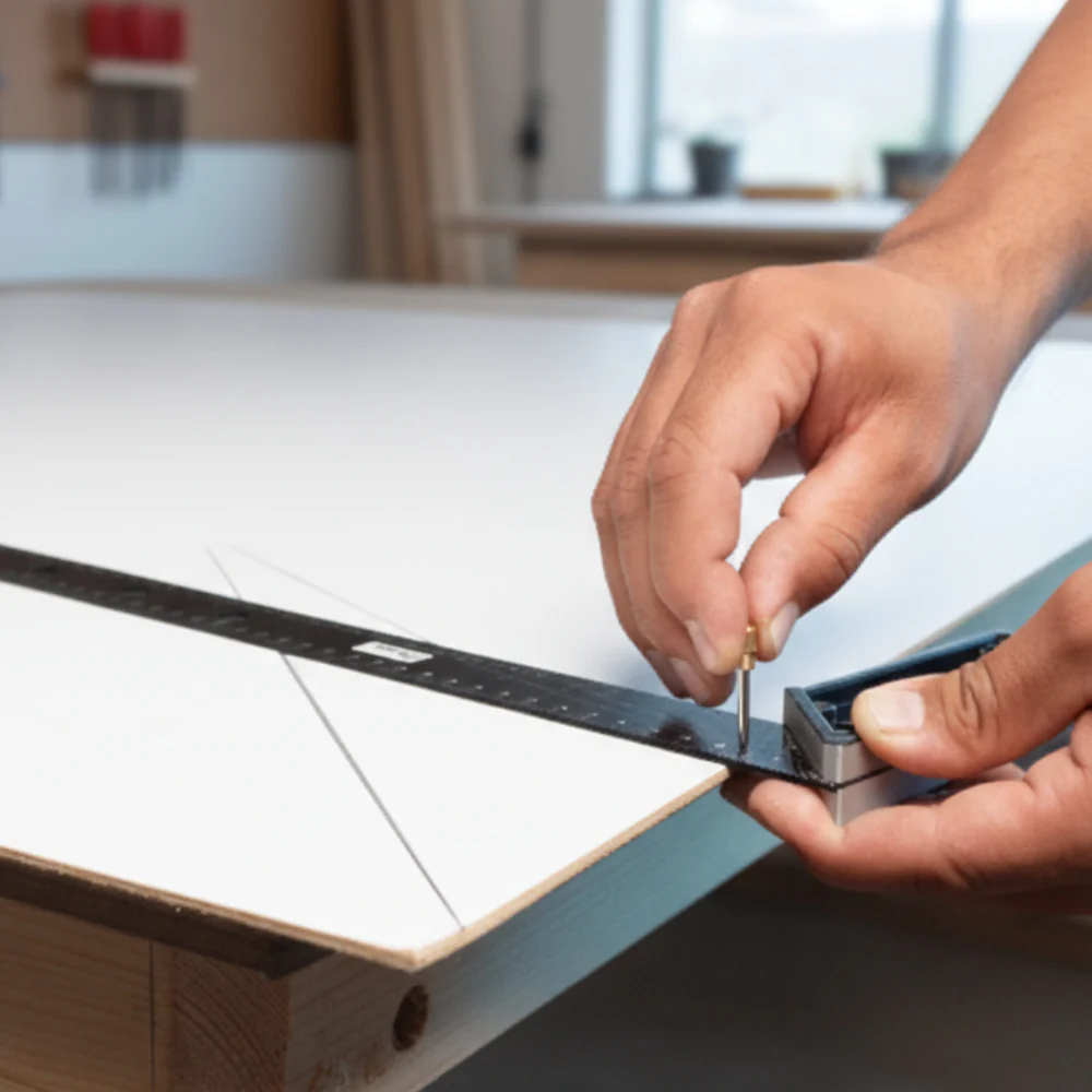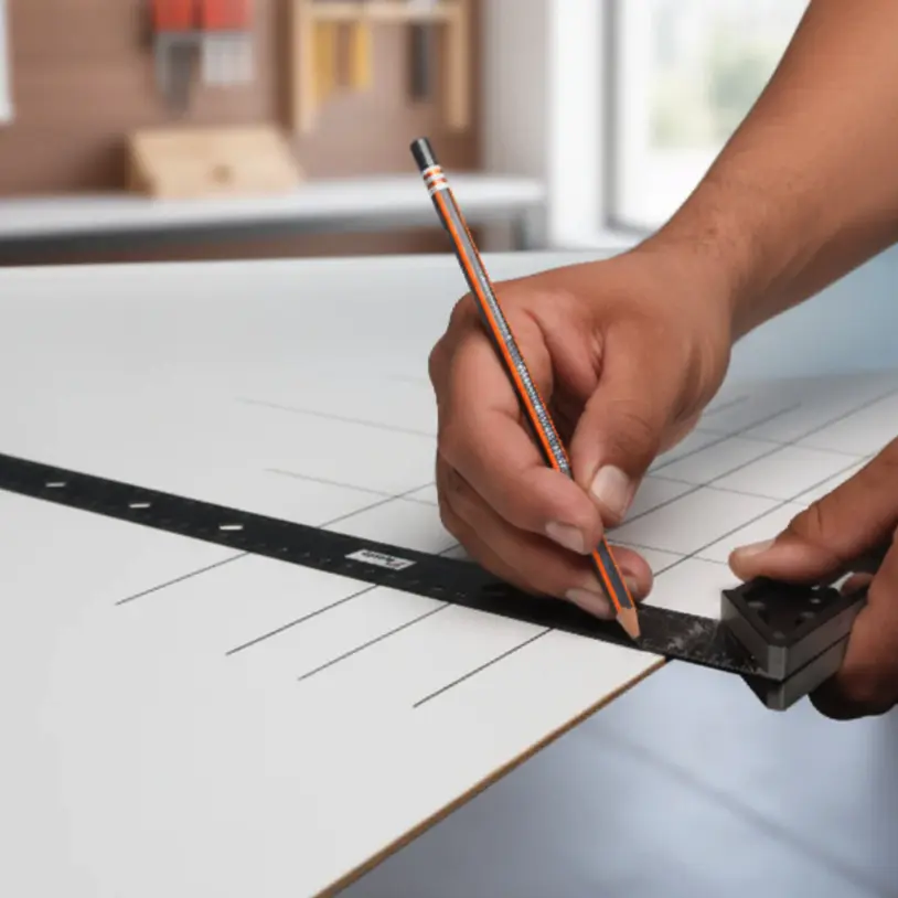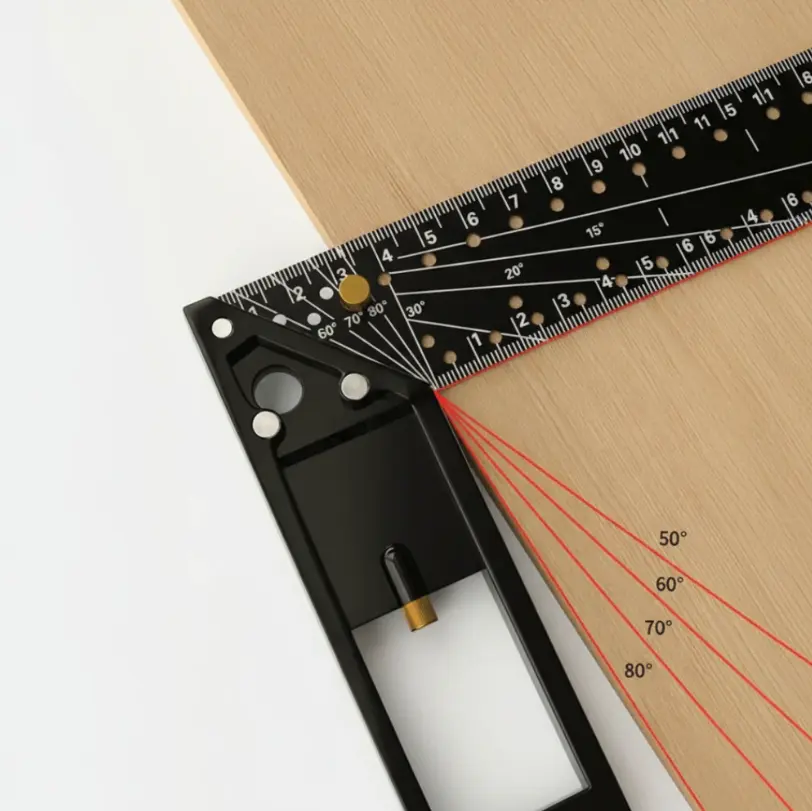 Designed for fast and accurate layout work, this square includes precision-machined marking holes for 10 commonly used angles: 10°, 15°, 20°, 30°, 45°, 50°, 60°, 70°, 80°, and 90°. Additional 1/2-inch spaced positioning holes let you scribe perfect parallel lines or repeat marks effortlessly. A built-in scribe pin is conveniently stored in the base—always ready for quick marking without hunting for a pencil.